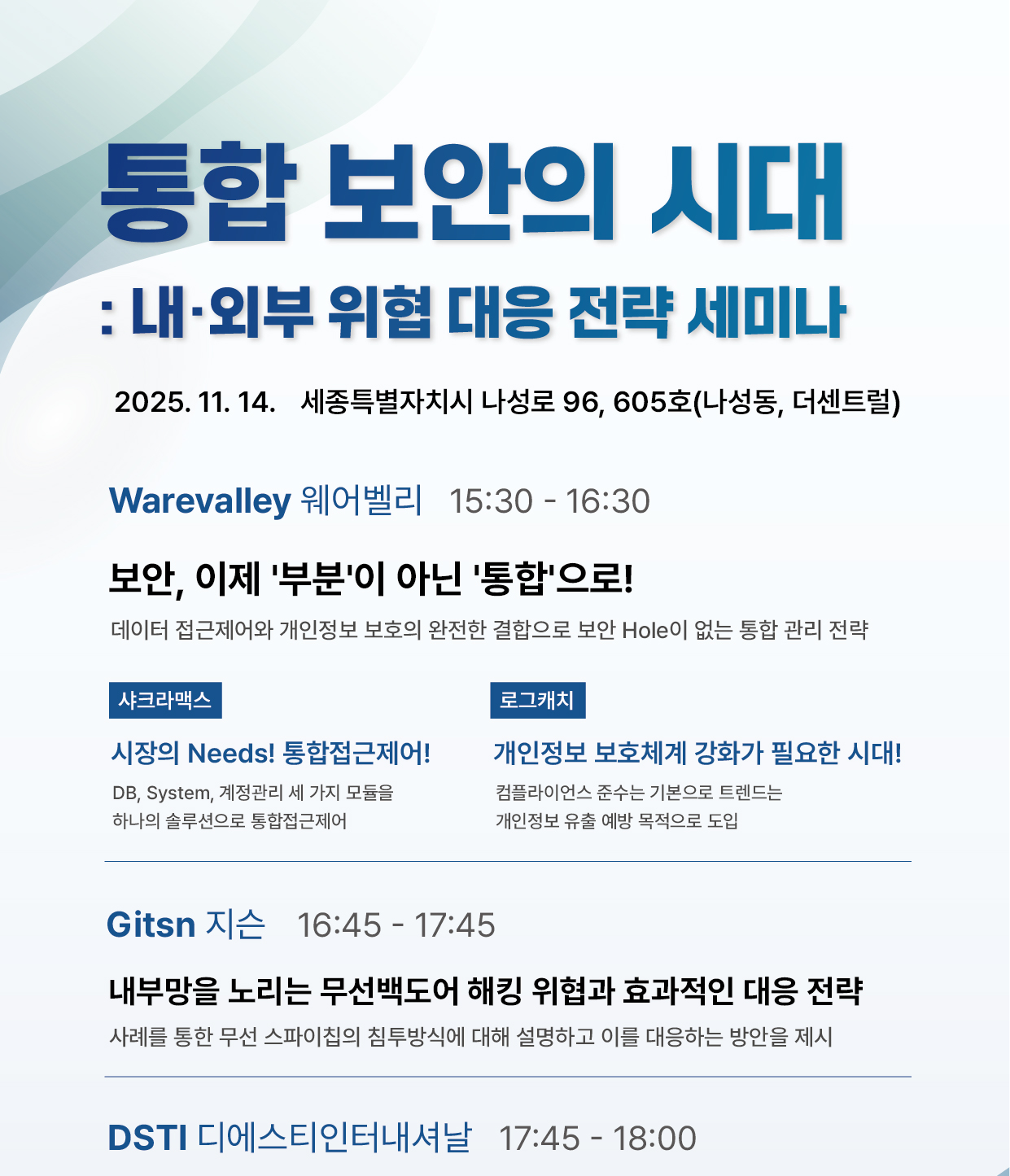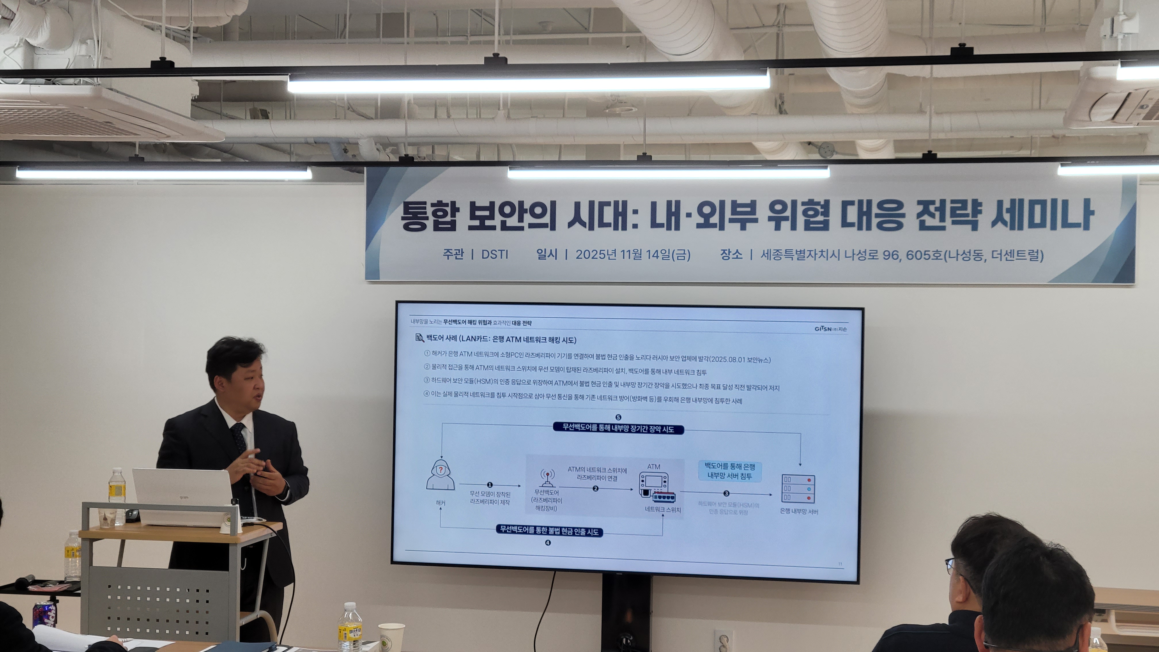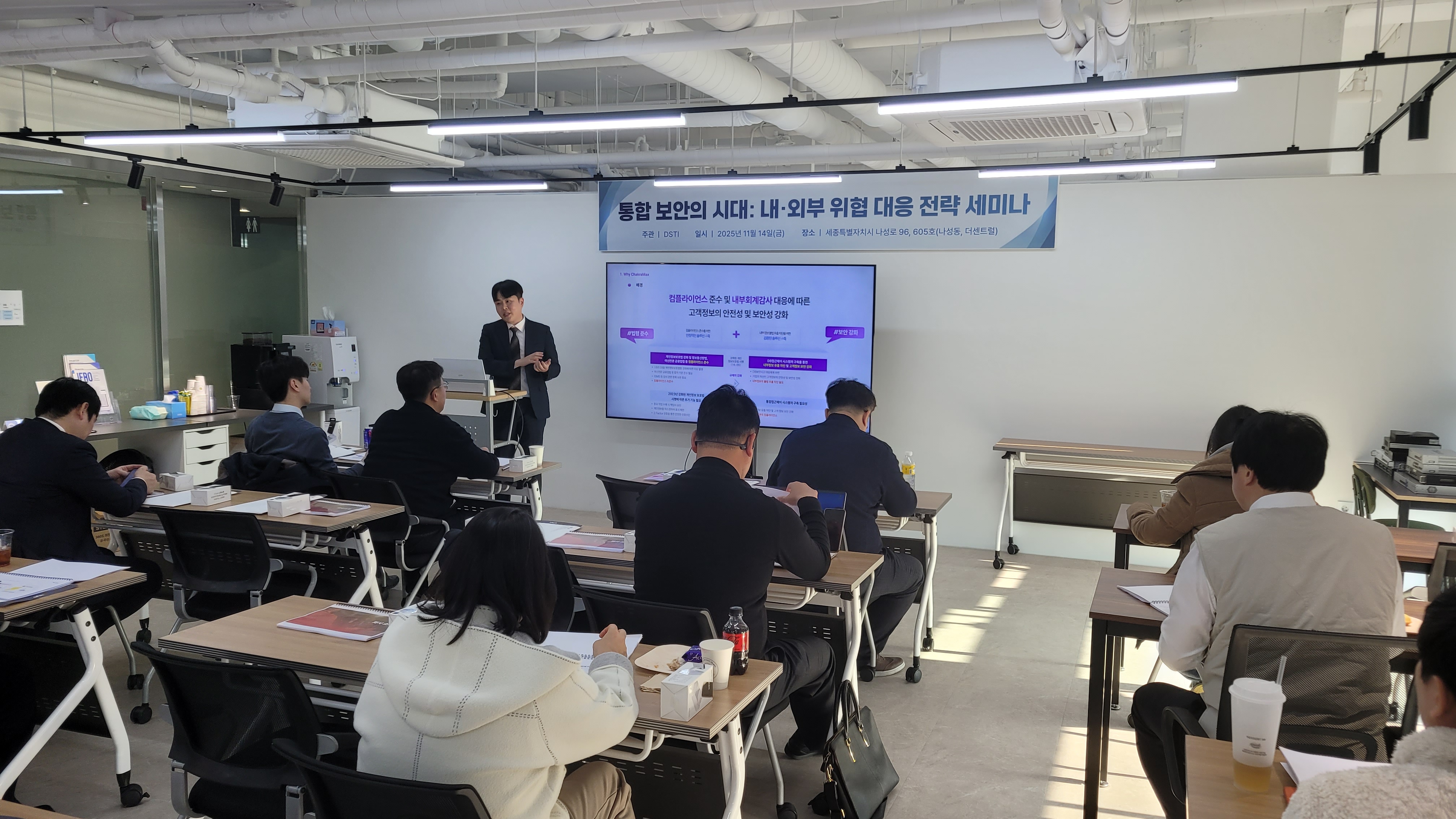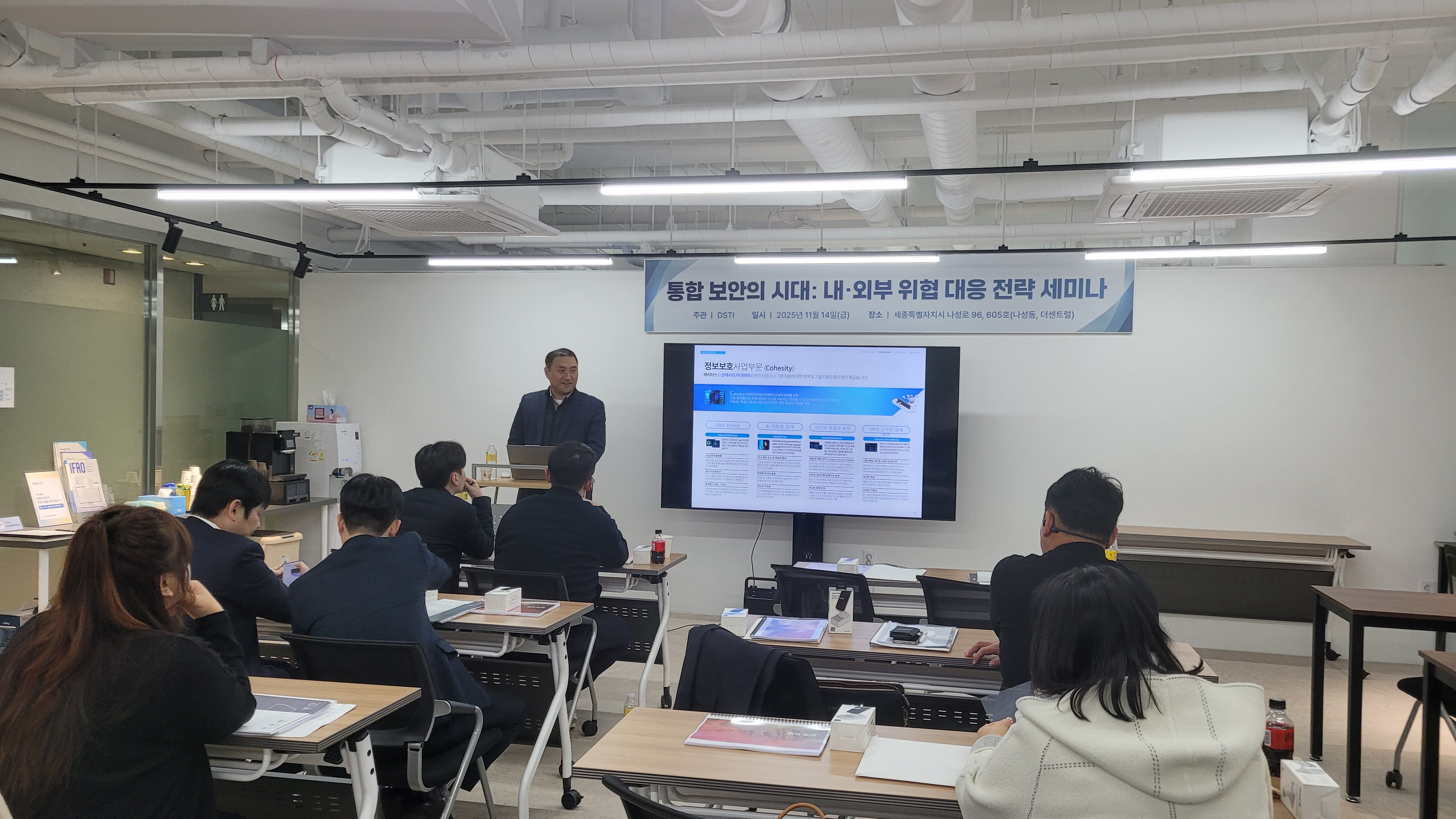 2025년 11월 14일, 세종 — (주)한국정보시스템은 (주)DSTI 주관으로 충청사이버보안 아카데미에서 “통합 보안의 시대, 내·외부 위협 대응 전략 세미나”를 성황리에 개최했다. 이번 세미나는 대전·세종·충청 지역의 IT 보안 전문 기업 관계자 30여 명이 참석해, 최신 보안 트렌드와 실질적인 위협 대응 전략을 공유하는 뜻깊은 자리였다.
