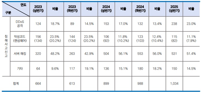 2023년에는 총 1,277건(상반기 664건, 하반기 613건)이었으나 2024년에는 1,887건(상반기 899건, 하반기 988건)으로 전년 대비 약 48% 증가하였습니다. 특히 2025년 상반기에는 1,034건이 신고되어 전년 동기 대비 15% 증가한 수치를 기록하였습니다. 2025년 상반기 신고 증가의 주요 원인은 IoT 기기 취약점을 악용한 DDoS 공격과 웹 셸(Web Shell)·악성 URL 삽입을 통한 서버 해킹 증가로 볼 수 있습니다. 또한 정보통신망법 개정(침해사고 정황 인지 후 24시간 이내 신고)과 4월 발생한 SK텔레콤 침해사고는 기업들의 경각심을 높여 신고 증가에도 영향을 주었습니다.