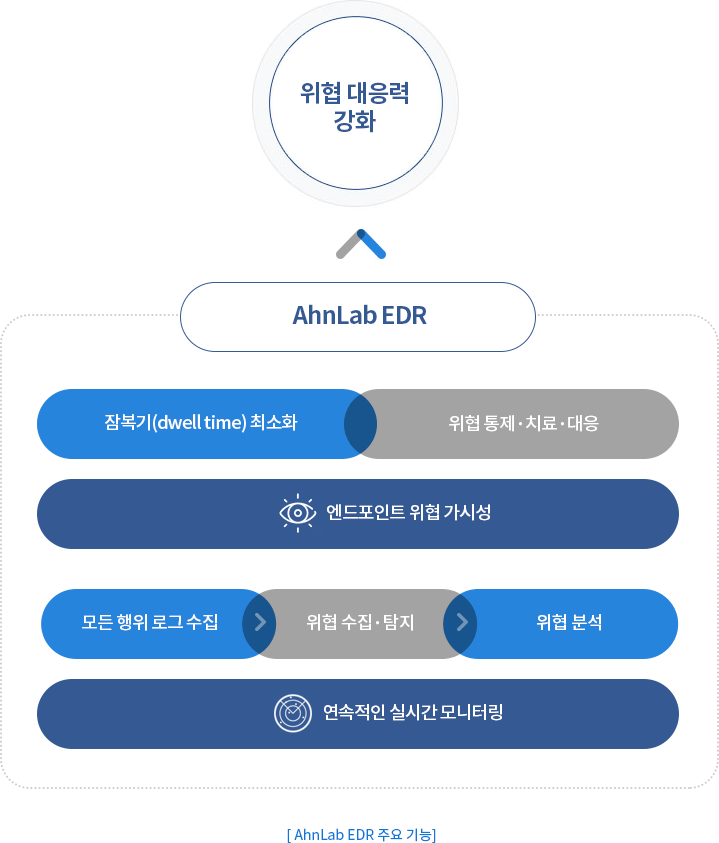 AhnLab EDR의 차별적인 위협 가시성을 기반으로 위협의 잠복기(dwell time)를 최소화하여 신속한 대응이 가능하며, 알려지지 않은 위협에도 사전에 대응할 수 있습니다.