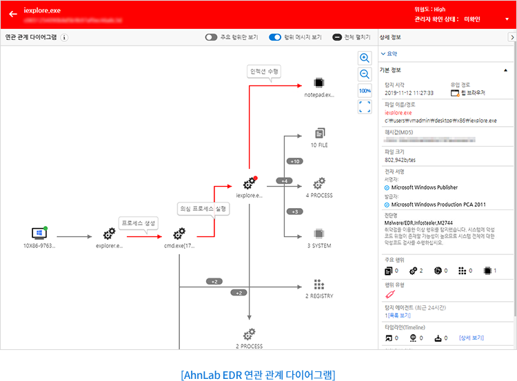 - 독자적인 행위 분석 엔진(MDP 엔진)을 통한 위협 분석 및 이벤트 타임라인 분석