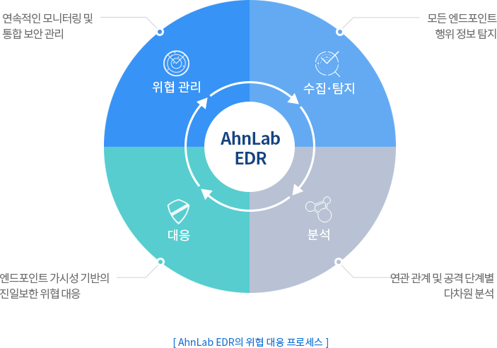 AhnLab EDR은 엔드포인트 영역에 대한 지속적인 모니터링을 통해 진일보한 위협 관리를 제공하는 차세대 엔드포인트 위협 탐지 및 대응(Endpoint Detection & Response) 솔루션입니다. 최고의 엔드포인트 보안 기업의 30년 악성코드 분석 기술이 응축된 AhnLab EDR은 엔드포인트 위협 가시성 기반의 더욱 강력한 위협 대응력 확보에 기여합니다. 위협 정보 수집. 분석 및 대응 관점의 변화가 반영된 EDR(Endpoint Detection & Response)은 안랩의 독자적인 분석 기술과 마이터 어택(MITRE ATT&CK) 프레임워크가 적용되어 AhnLab EPP를 기반으로 다양한 보안 기능 연계를 통해 엔드포인트 위협 가시성을 확장하여 실질적인 위협 대응을 제공합니다. AhnLab EDR은 독자적인 행위 분석 엔진인 MDP 엔진을 통해 엔드포인트의 실제 OS 상에서 모든 행위 정보를 수집 및 분석합니다. 다양한 관리 기능을 통해 기업 및 기관의 환경에 따라 주도적이며 능동적인 위협 대응이 가능합니다.