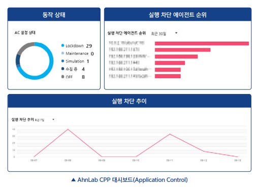 - 실행 차단 추이 현황, 실행 차단 에이전트 및 파일 순위 정보 등 주요 이벤트에 대한 직관적인 가시성 제공