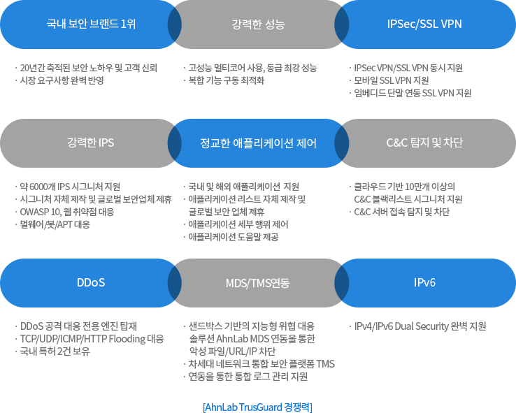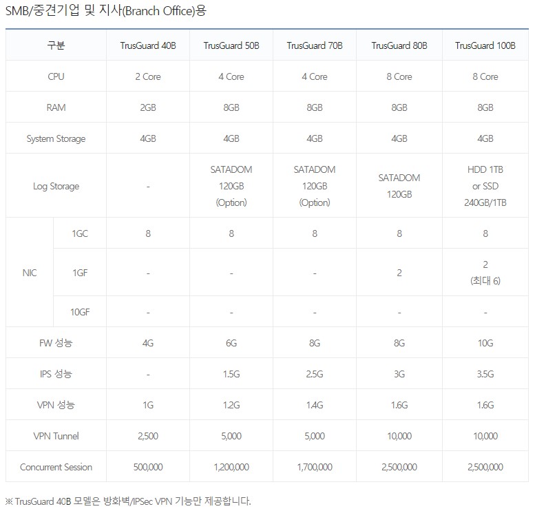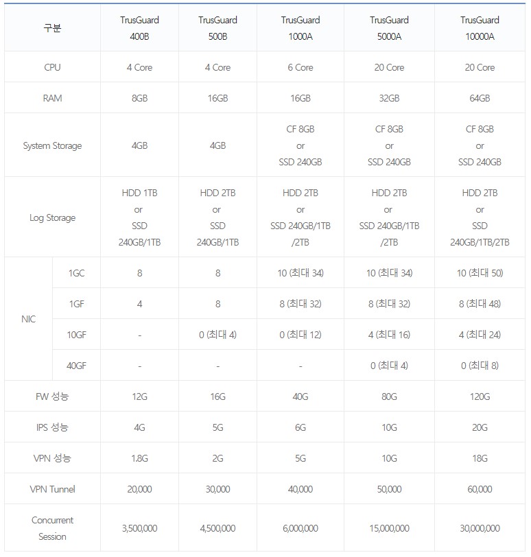 - TrusGuard 10000A : 120Gbps 처리, 70만 이상 CPS
