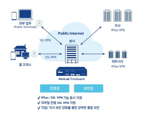 TrusGuard는 IPSec/ SSL VPN 기능을 동시에 지원해 언제, 어디서나 안전한 네트워크 접속을 구현합니다. 또한 IPS 및 애플리케이션 컨트롤을 기반으로 VPN 터널을 통한 악성코드 확산을 강력하게 제어합니다.