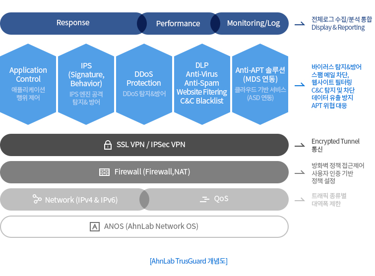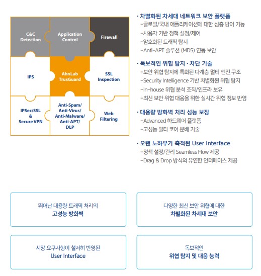 AhnLab TrusGuard는 6천여 국내 고객 사이트에서 활용하고 있습니다. 그만큼 뛰어난 성능과 강력한 보안 위협 대응 기술력을 인정받은 차세대 네트워크 통합 보안 시스템입니다. AhnLab TrusGuard는 방화벽, IPS, 애플리케이션 제어, VPN, C&C 탐지/차단, 안티바이러스/안티스팸(Anti-Virus/ Anti-Spam), 데이터 유출 방지(DLP) 등 다양한 보안 기능을 제공합니다. DDoS 공격에 대한 고유의 자체 방어 기술을 적용하고 있습니다. IPSec/ SSL VPN을 통해 외부에서도 효율적으로 안전하게 내부 시스템에 접속할 수 있도록 구성되었습니다. 또한 40B, 50B, 70B, 80B, 100B, 400B, 500B, 1000A, 5000A, 10000A 등 로우-엔드 모델부터 데이터센터급 모델까지 다양한 제품 라인업을 갖추고 있어 기업의 네트워크 규모에 따라 선택적으로 사용할 수 있습니다. 특히, 대용량 네트워크 보안 솔루션 AhnLab TrusGuard10000A는 최대120Gbps의 트래픽 처리와 70만 CPS처리가 가능해 데이터센터 및 클라우드 환경에 최적화된 차세대 방화벽입니다.