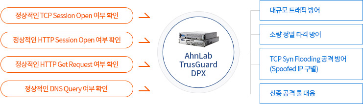 TrusGuard DPX는 대용량 공격 / 상태 고갈 공격 / 애플리케이션 레이어 공격 탐지 및 방어 기능을 제공합니다.