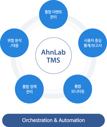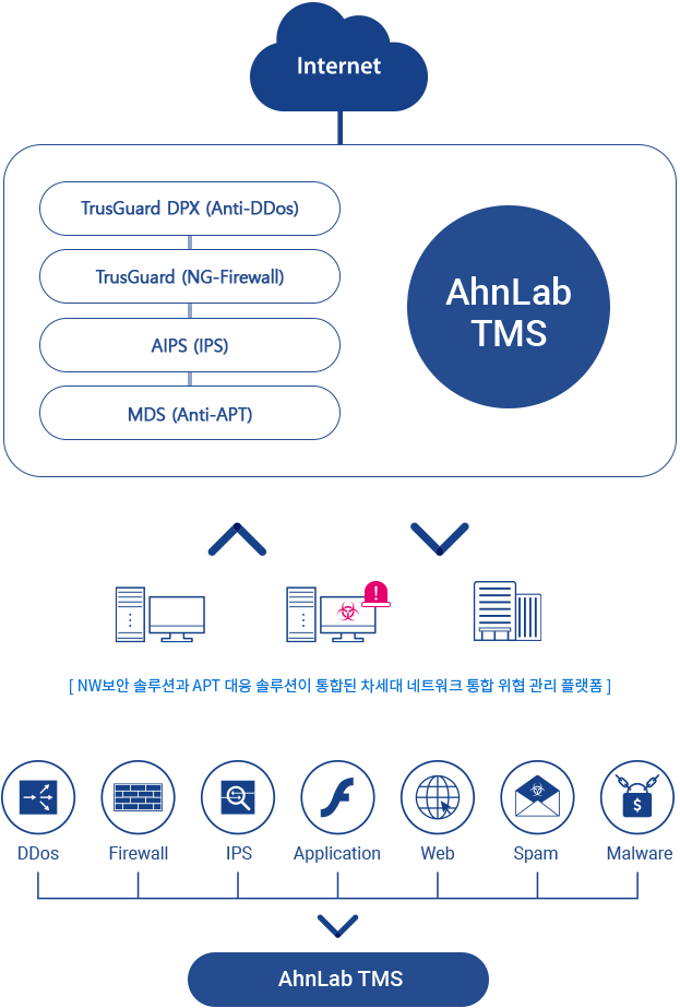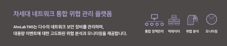 AhnLab TMS(Threat Management System)는 다수의 장비를 관리하며 다양한 위협 정보를 종합적으로 모니터링하고 분석하며 연동된 장비들과 유기적으로 대응하는 네트워크 통합 위협 관리 플랫폼입니다. 연동 장비에 대한 효율적인 정책 관리와 대용량 이벤트에 대한 수집/ 관리, 차세대 분석 기술을 통한 심층적인 분석과 대응을 제공하는 차세대 통합 위협 관리 솔루션입니다.