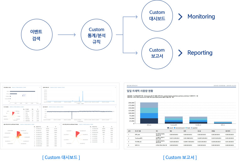 - 다양한 이벤트에 대한 모니터링과 가시성을 제공하기 위해서 AhnLab TMS는 사용자 중심의 유연한 Custom 모니터링과 리포팅 기능을 제공합니다. 보안 관리자는 발생한 이벤트를 검색하고, 지속적인 모니터링과 분석이 필요한 경우 통계/분석 규칙을 생성 후 Custom 대시보드를 통한 모니터링과 Custom 보고서를 통한 리포팅을 유연하게 사용할 수 있습니다.