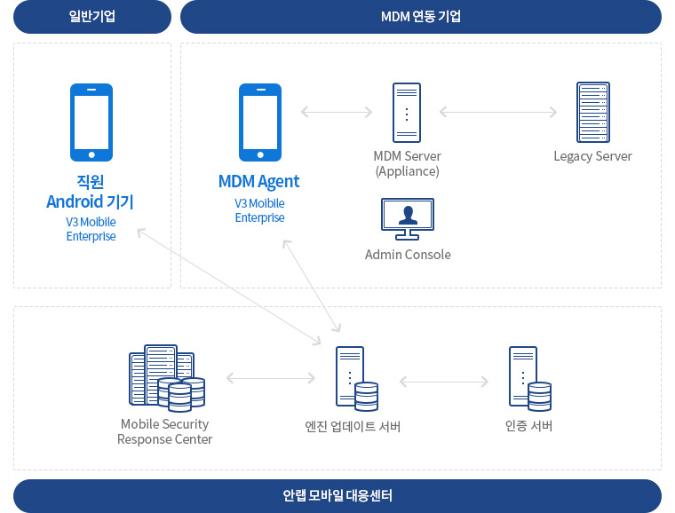 AhnLab V3 Mobile Enterprise는 기업의 모바일 환경 요구 사항에 최적화된 기업 모바일 전용 보안 프로그램입니다. AhnLab V3 Mobile Enterprise는 스마트 모바일 기기에서 발생할 수 있는 각종 보안 위협은 물론, 기업의 요구와 환경을 다각도로 분석. 반영해 안티멀웨워(Anti-Malware), 그룹웨어 연결 등 모바일 기기에 최적화된 기능을 제공합니다. 또한 에이전트와의 인터페이싱을 통해 MDM(Mobile Device Management) 서버와 연동되어 동작함으로써 안전한 기업 모빌리티 환경 구축에 기여합니다.